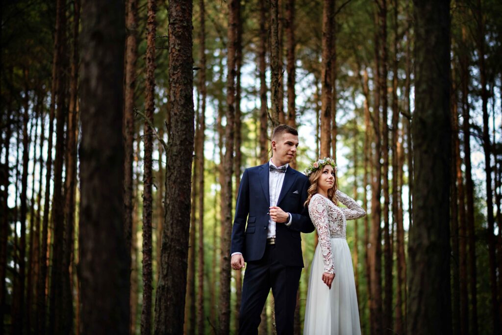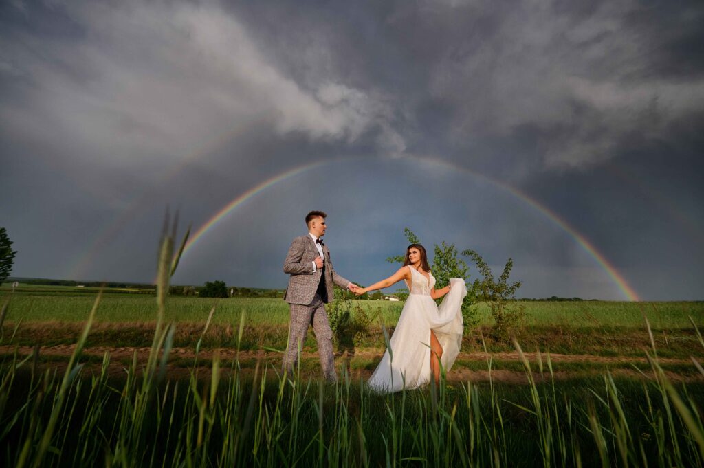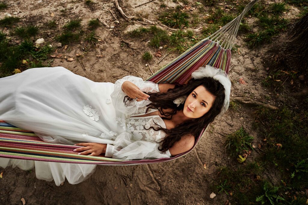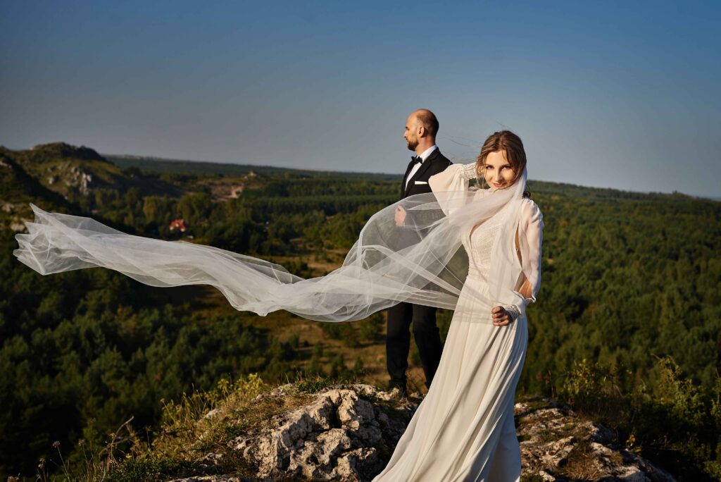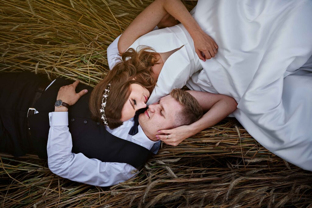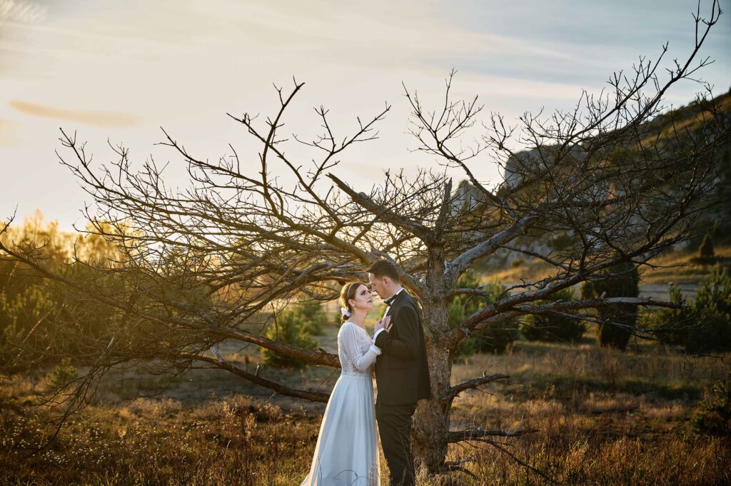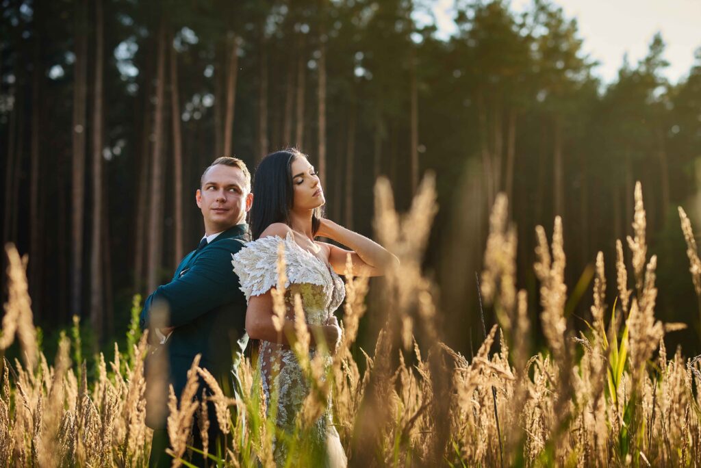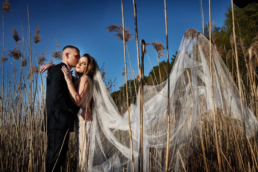 Plener w klimacie wesela – kontynuacja motywu przewodniego wesela (boho, rustykalny, glamour) w plenerze, co sprawia, że całość reportażu staje się spójną opowieścią.