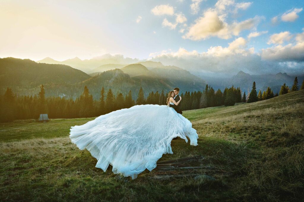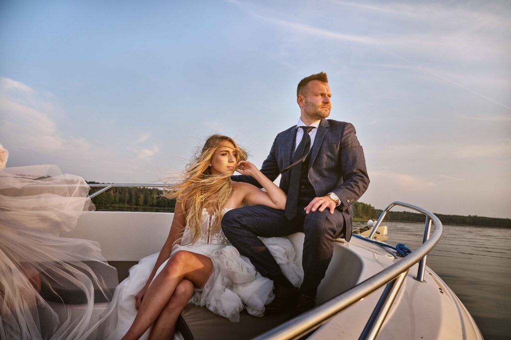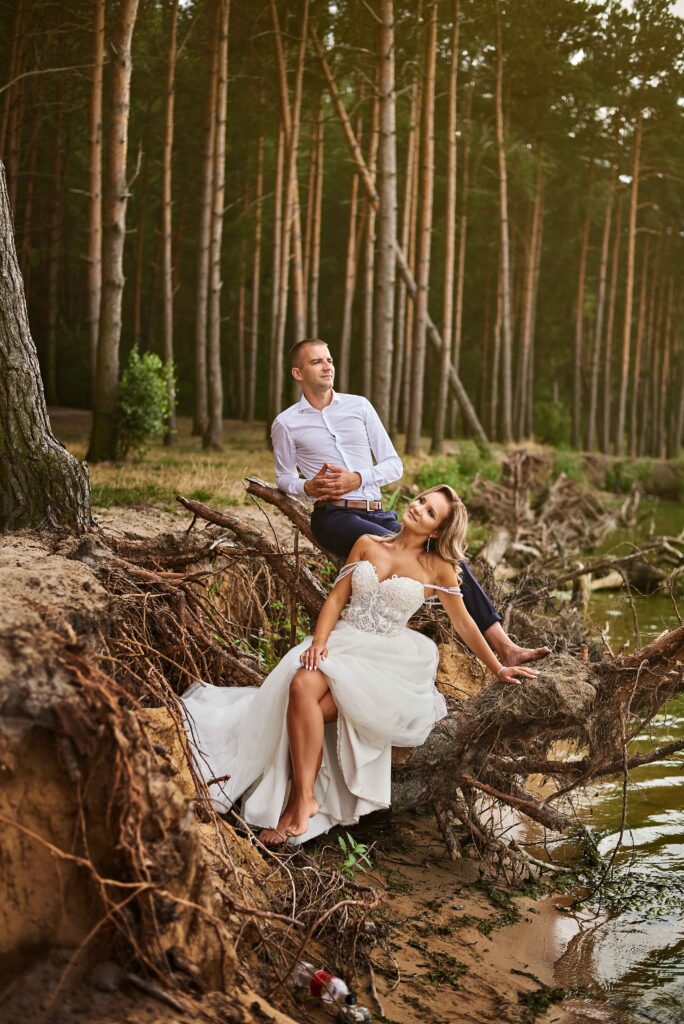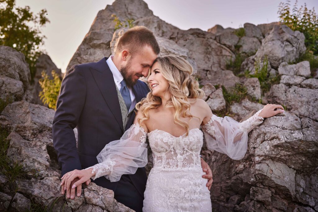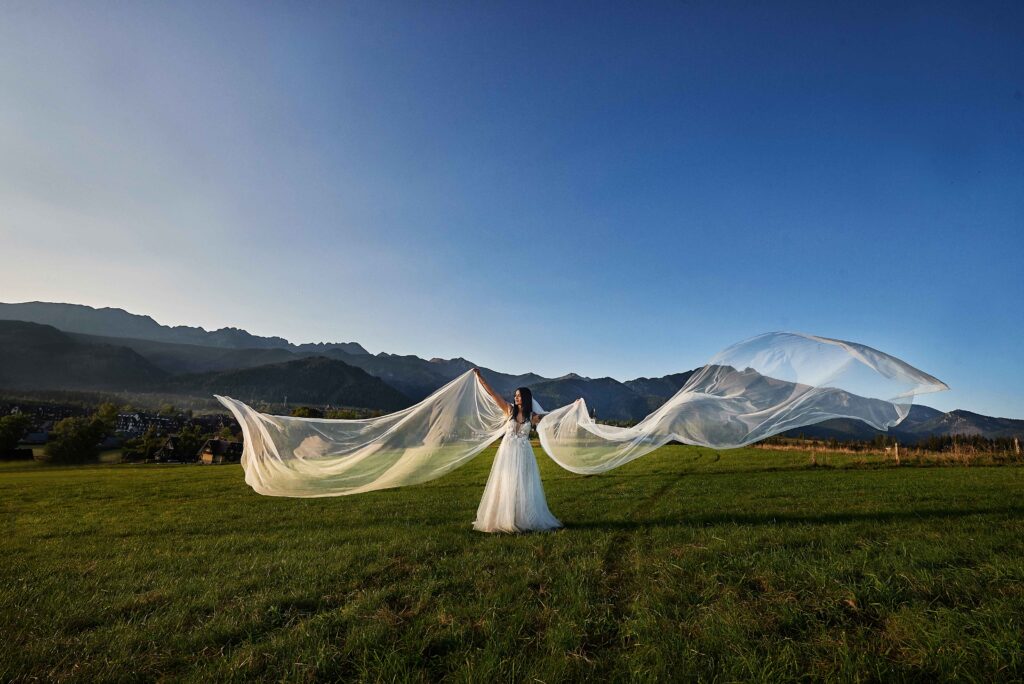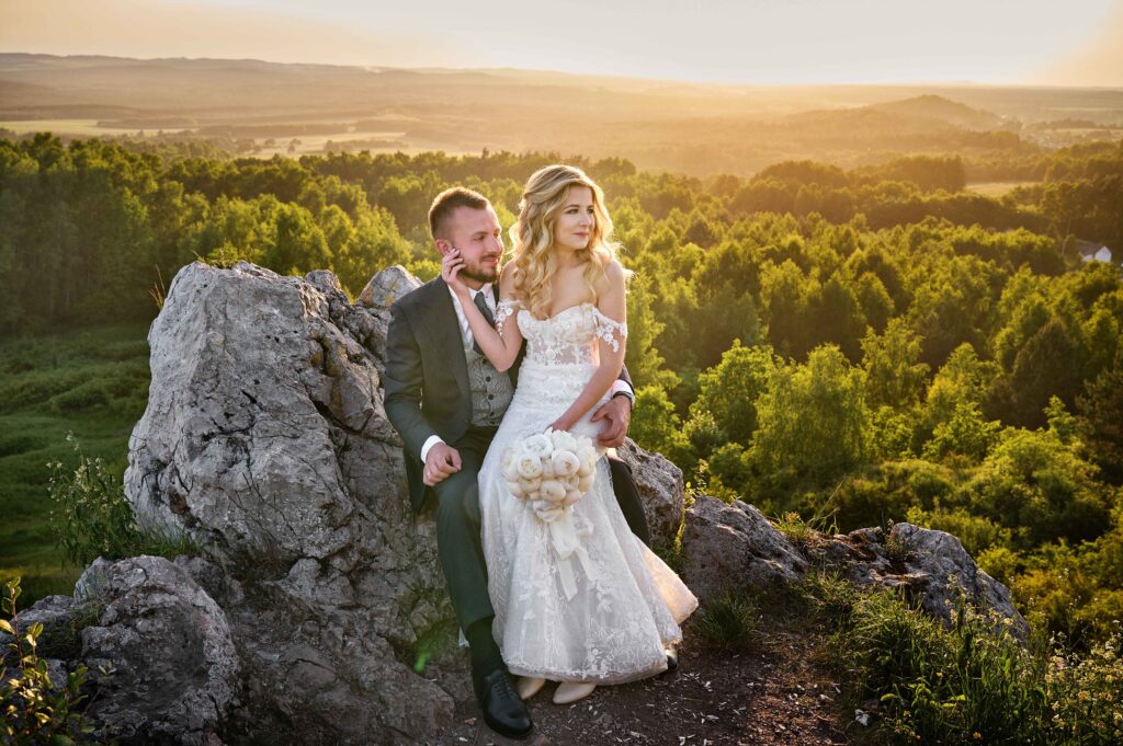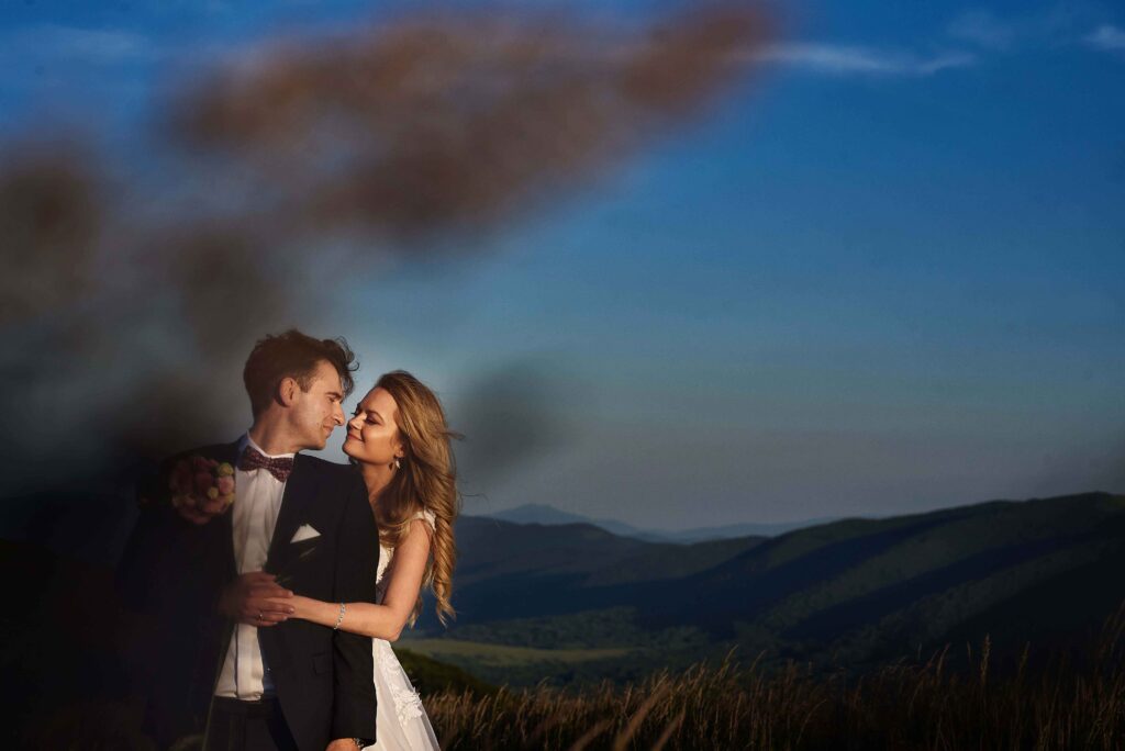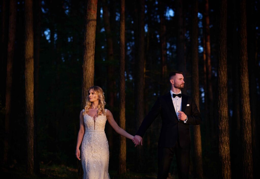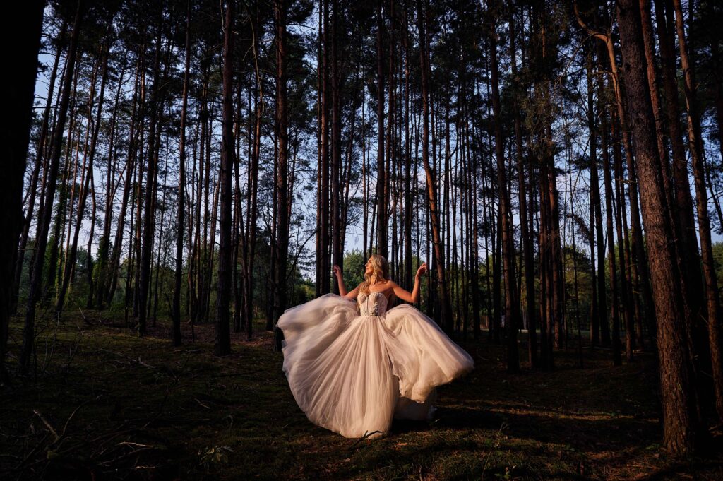 Plener w klimacie wesela – kontynuacja motywu przewodniego wesela (boho, rustykalny, glamour) w plenerze, co sprawia, że całość reportażu staje się spójną opowieścią.