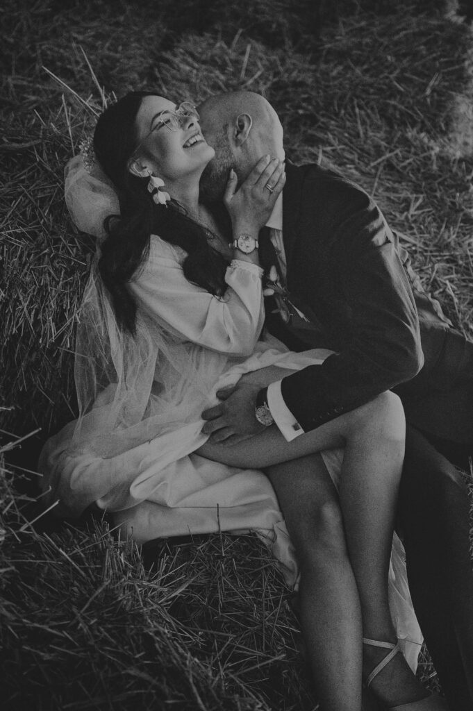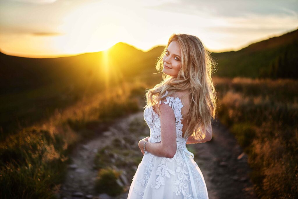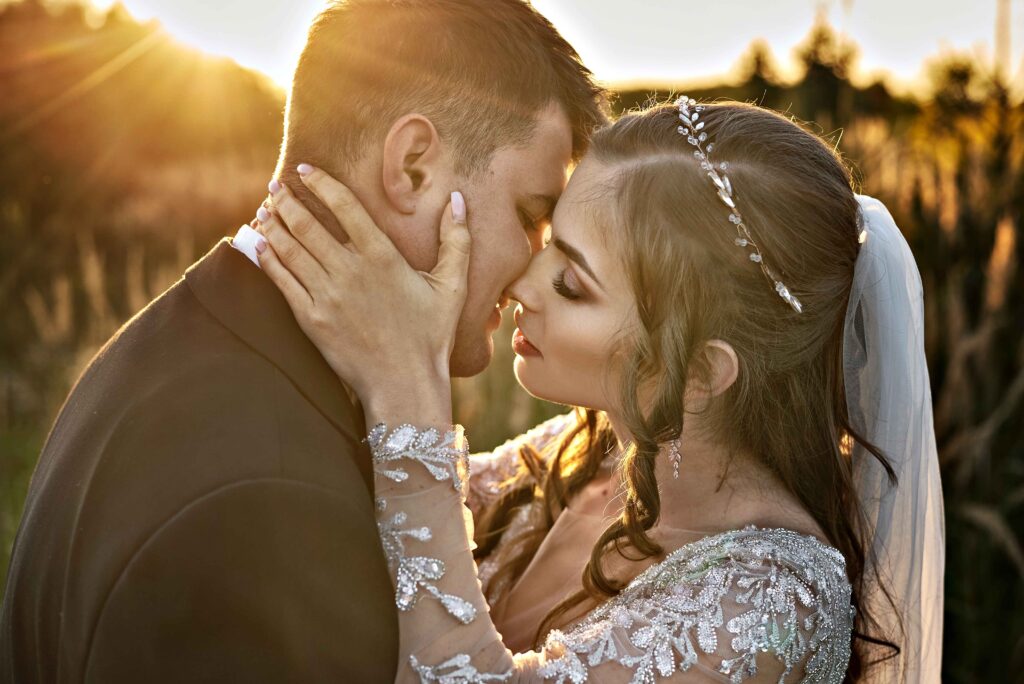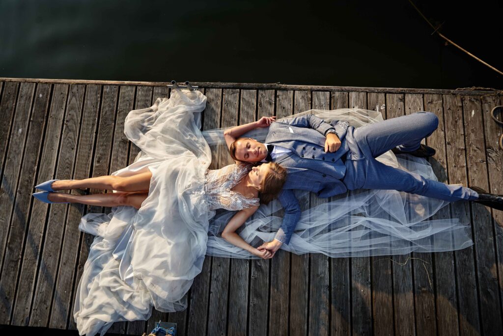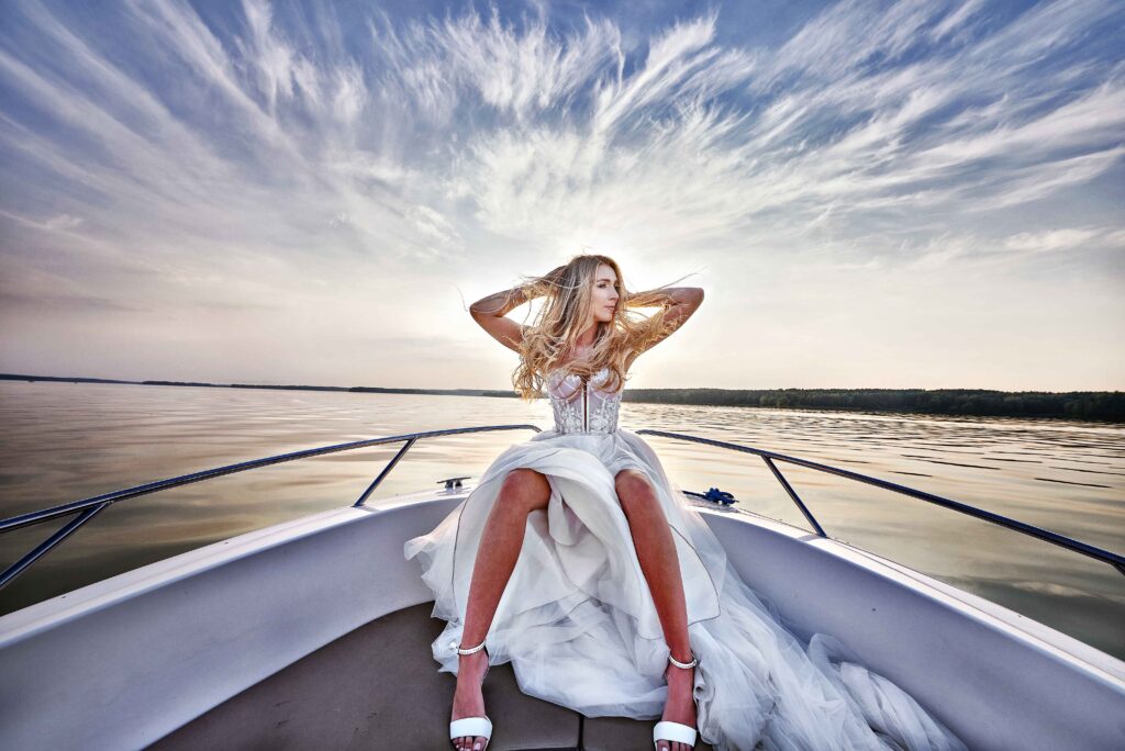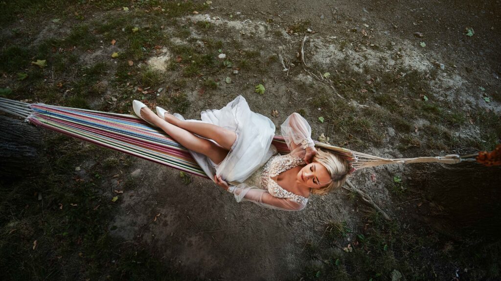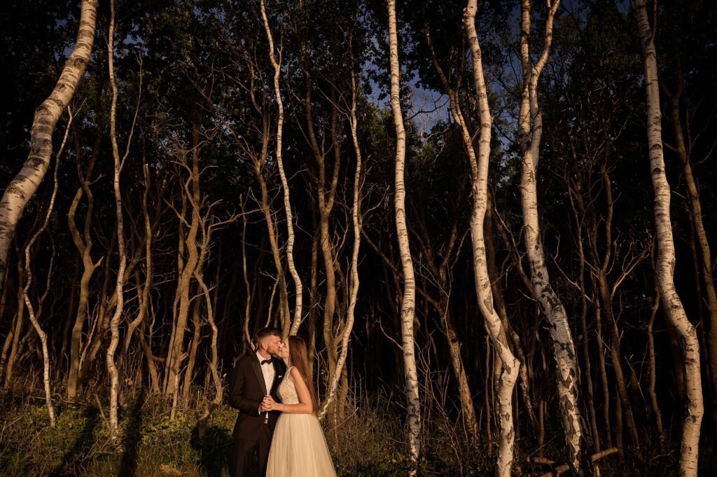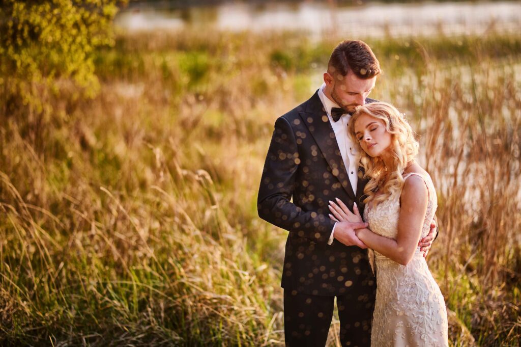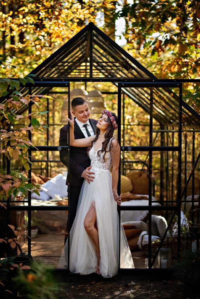 Plener w klimacie wesela – kontynuacja motywu przewodniego wesela (boho, rustykalny, glamour) w plenerze, co sprawia, że całość reportażu staje się spójną opowieścią.