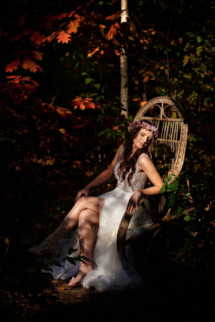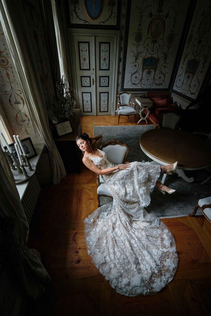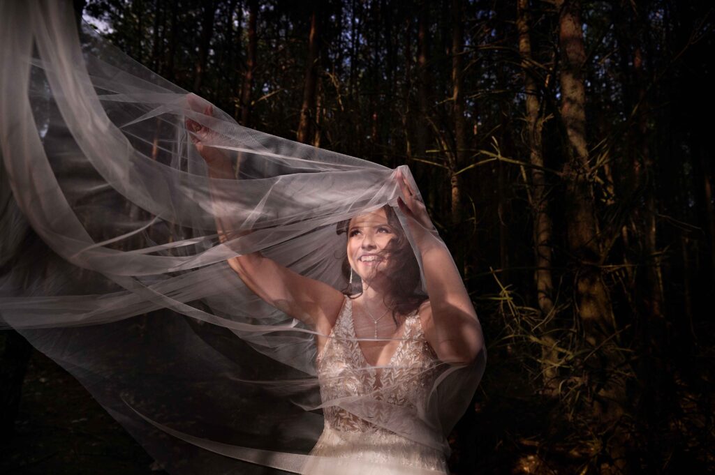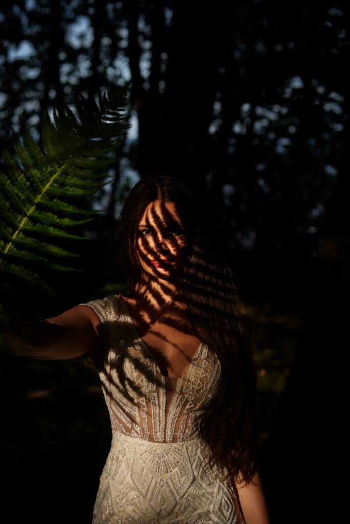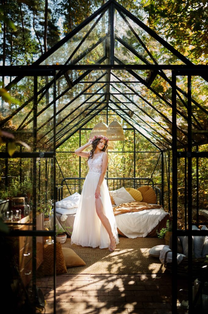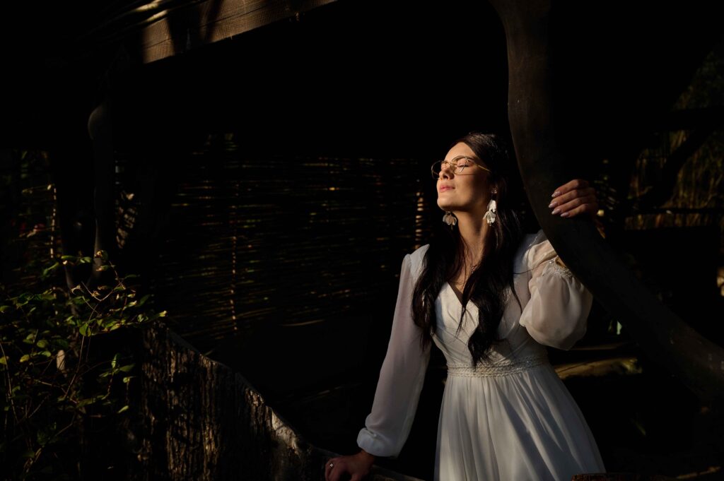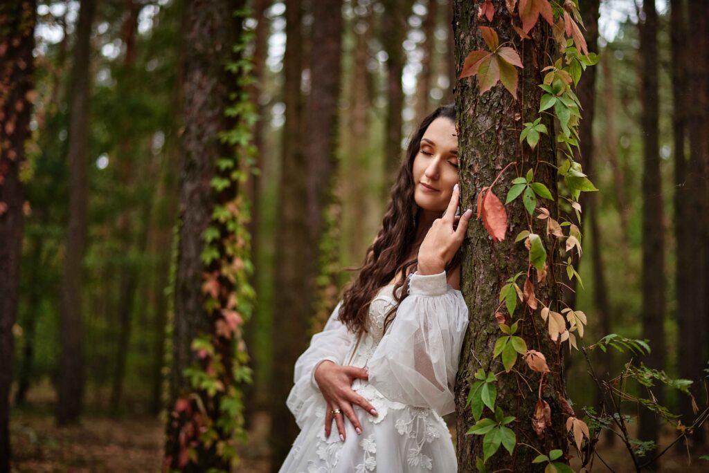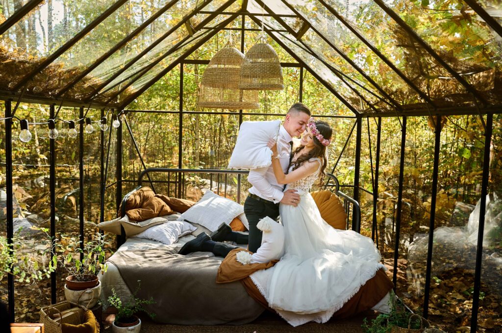 Plener w klimacie wesela – kontynuacja motywu przewodniego wesela (boho, rustykalny, glamour) w plenerze, co sprawia, że całość reportażu staje się spójną opowieścią.